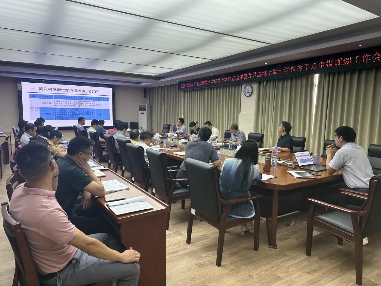 会上,研究生院许尤厚从师资、经费、生均比等方面对标汇报了学校上一轮新增博士授予单位立项建设情况以及下一轮申报建设要求。海洋学院、机械与船舶海洋工程学院、教育学院等10个学院对标申报条件,分别就本院学位点建设情况进行了汇报,并对本院学位点未来的发展规划进行了介绍。